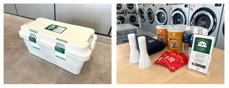 非常用備蓄品を店内に常備した「そなえるランドリー」の取り組み(写真は備蓄品ボックスと備蓄品の一部)